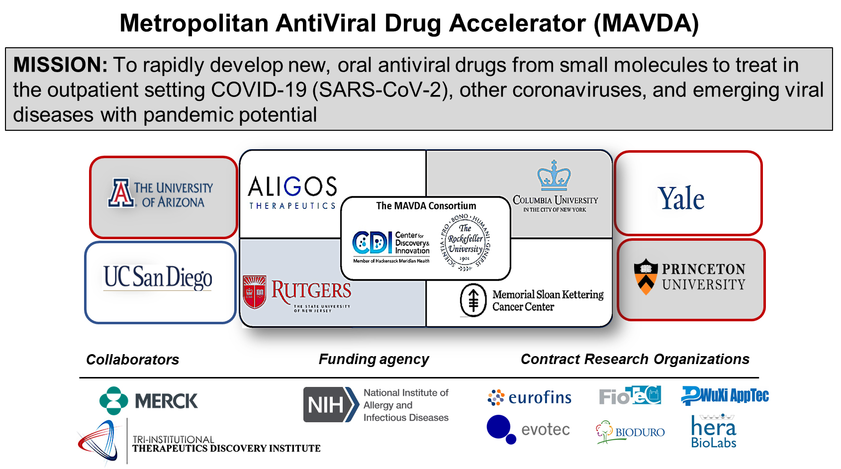 MAVDA combines world-class virologists and academic drug development researchers from Rockefeller University, Columbia University and Memorial Sloan-Kettering Cancer Center in New York City and the Center for Discovery and Innovation and Rutgers University in New Jersey, along with proven antiviral drug developers Merck, the Tri-Institutional Therapeutics Discovery Institute (Tri-I TDI)-Takeda, and Aligos.